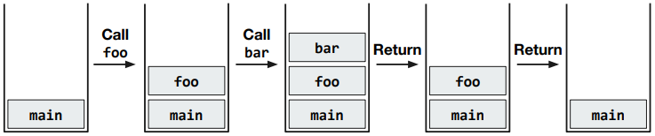Lots of programming language runtimes utilizes a call stack to manage function calls ○ A call stack is a stack that stores functions’ local data ○ When calling a function, the callee function data is pushed onto the call stack ○ When returning a function, the function data is popped out from the call stack