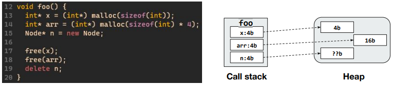 Memory is allocated on a heap ○ Call it dynamic memory allocation ○ The size of memory to be allocated is calculated at runtime ○ The allocated memory is valid for long-time before deallocating it ■ Need to explicitly alloc/dealloc memory ■ Be careful to avoid memory leak or dangling pointer errors