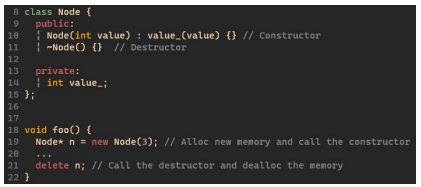 A keyword new is used to allocate memory in C++ ○ Basically, it works as the same as malloc ○ But, it creates an object and invokes its constructor as well ○ It is paired with delete keyword ■ it works as the same as free ■ But, it deletes an object and invokes its destructor as well