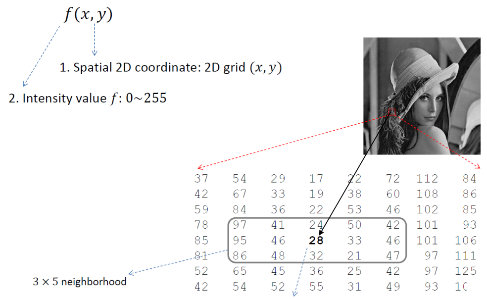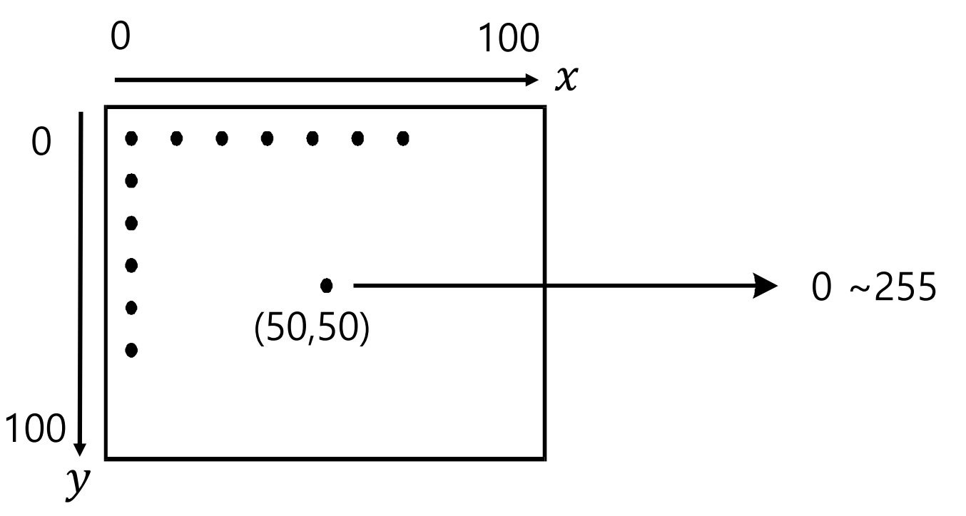 이미지는 대중적으로 2차원 함수 f(x, y)라고 표현하며, (x, y) 형태로 좌표를 표현한다.