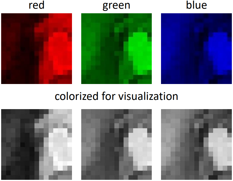 Color 이미지는 위 gray image의 픽셀값을 각각 R, G, B에 한 세트씩 갖고 있다.
