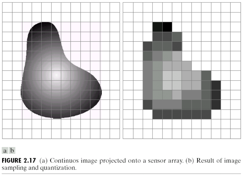 그런 연속적인 형태의 피사체를 디지털화하면 오른쪽 그림과 같이 이미지화된다. 무한한 픽셀을 모두 다 표현할 수 없기 때문에 오른쪽 그림처럼 픽셀에 매핑해줘야하는 것이다.