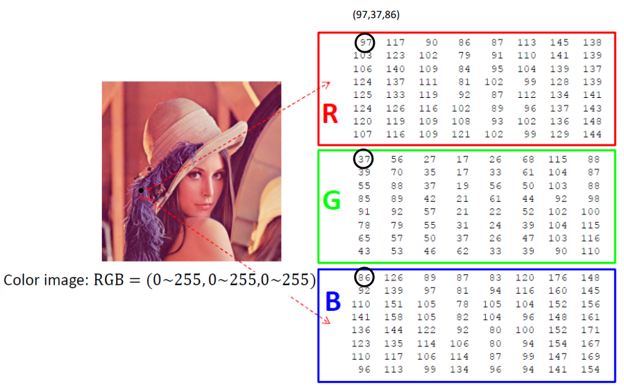 gray image는 1-D scalar값을 나타내고, color image는 RGB 세 종류가 있으므로 3-D vector 값을 나타낸다.