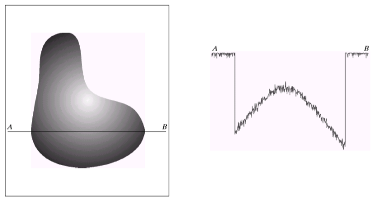 그림의 AB 직선을 임의로 그어보자. 이 선의 픽셀값을 x축은 거리, y축은 밝기로 설정한 그래프로 나타내면 오른쪽 그림과 같다.