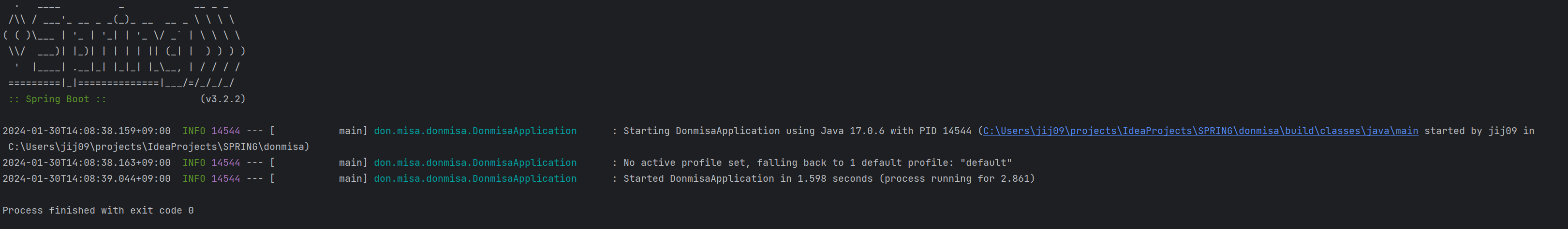 2024-01-30T14:08:38.163+09:00 INFO 14544 --- [ main] don.misa.donmisa.DonmisaApplication : No active profile set, falling back to 1 default profile: "default"