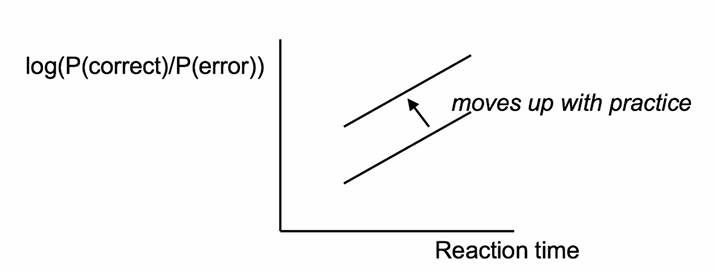 Accuracy(정확도)는 Reaction Time(반응 시간)에 따라 달라진다. 이때 Accuracy(정확도)란 lapse 혹은 slip을 일으킬 수 있는 가능성을 말한다. 연습을 통해 성능이 향상되면, 위 선분이 위로 올라가면서 더 빠른 반응시간에도 높은 정확도를 달성할 수 있다.