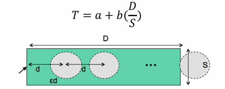 어떤 공간을 통과할 때 걸리는 시간(T)은 그 공간의 길이(D)와 너비(S)에 영향받는다.