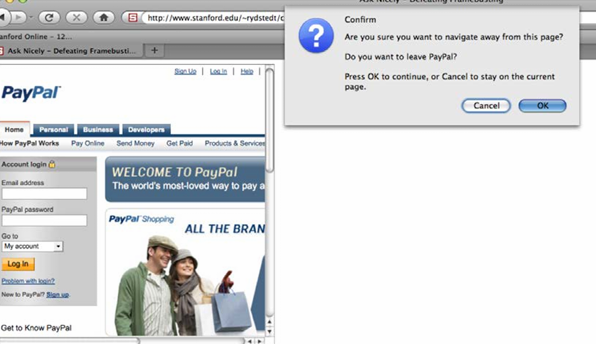 자바스크립트 이벤트 핸들러 중 window.onbeforeunload는 프레임 바깥으로 빠져나오는 경우 호출이 된다. 공격자가 framebusting된 타겟 웹사이트의 iframe에 onbeforeunload 핸들러 코드가 있는 본인 웹사이트를 추가한다. ?맞음?