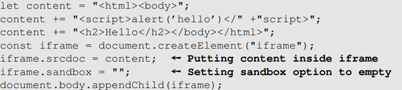 "sandbox" 속성으로 iframe의 기능 및 범위를 제한할 수 있다. 기존에는 frame 내의 타 출처 코드나 페이지가 악성 행동을 하지 못하도록 나온 보안 기술이지만, 이를 악용하면 clickjacking을 위해 다른 페이지를 가져올 때 그 페이지의 framebusting 코드를 실행하지 못하도록 할 수 있다.