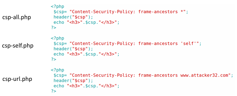 - frame-ancestors : 이 프레임을 담는 곳이 source인 경우에만 스크립트를 보여준다.